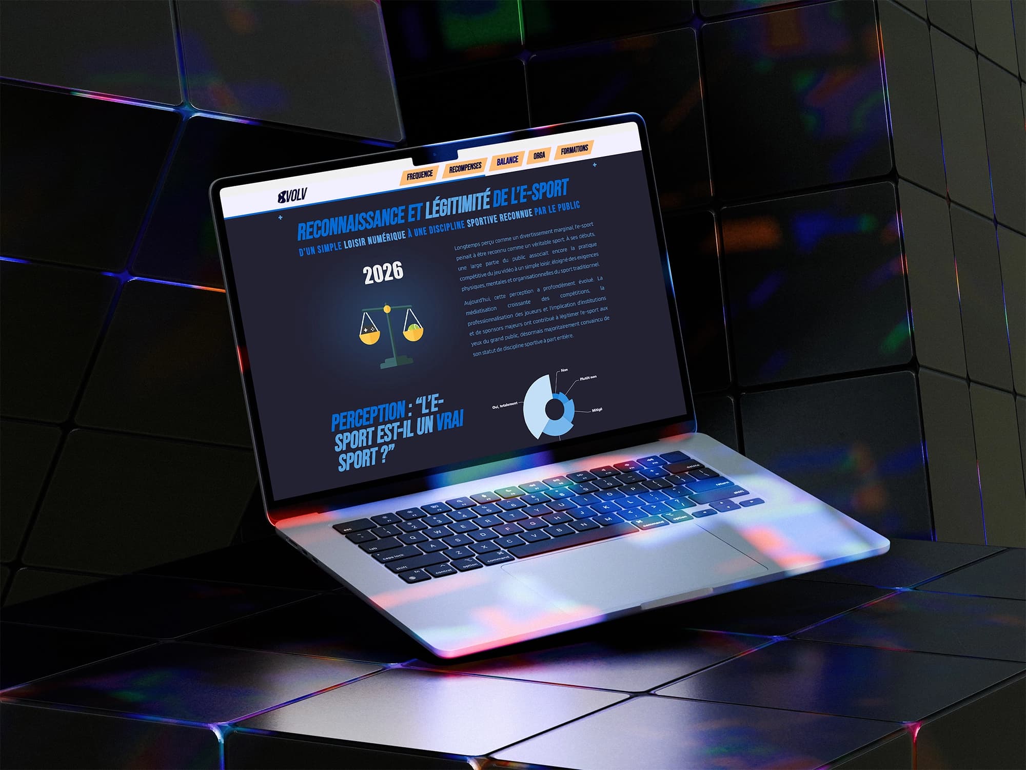 EVOLV est un site web narratif consacré à l’évolution de l’e-sport et à sa transformation progressive en discipline sportive structurée. Le projet combine illustrations, animations et éléments de data visualisation pour proposer une lecture immersive du sujet. Les données viennent appuyer le discours à travers des formes graphiques et du motion design, afin de rendre l’ensemble plus lisible, dynamique et engageant. Lottie est un format d’animation vectorielle destiné au web, issu d’After Effects, qui permet d’intégrer des animations légères, fluides et interactives directement sur le web. Utilisées ici pour accompagner les données et les messages, ces animations facilitent la compréhension du sujet tout en renforçant l’aspect immersif du site.